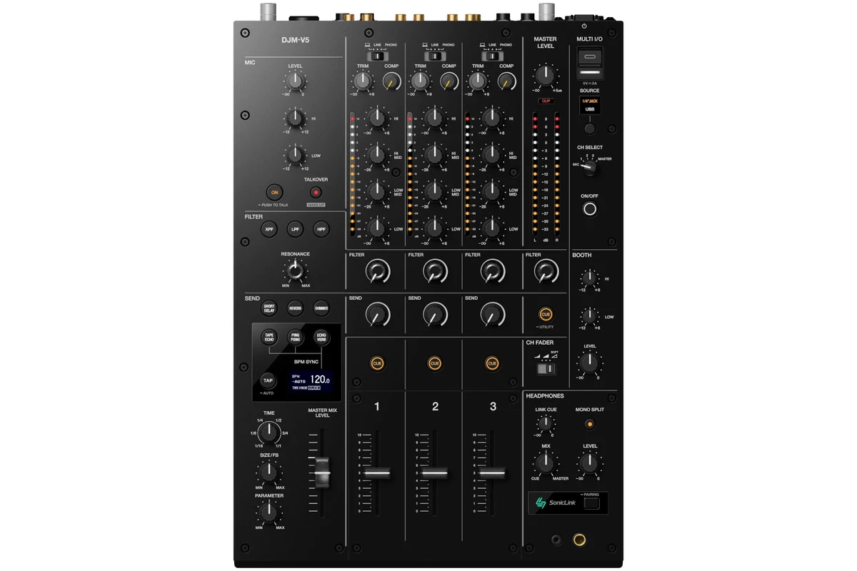 A DJM-V5 a DJM-V10 lényegét veszi át, és egy kompaktabb, 3-csatornás egységbe sűríti. Bár fizikailag kisebb, hatalmas lehetőségeket kínál a kompromisszumok nélküli kreatív keveréshez, még a korlátozott helyű DJ-fülkékben is. A DJM-V5 használatával fejlettebb effektusok állnak rendelkezésre, beleértve a továbbfejlesztett szűrőket és a Send FX-et, hogy kifejezhesse önmagát, DJM-V5-tel – függetlenül a beállítástól. A beépített SonicLink adó, amely az AlphaTheta egyedülálló, rendkívül alacsony késleltetésű vezeték nélküli technológiáját használja, nagyobb szabadságot biztosít a fellépéshez. Egyszerűen párosítsa a HDJ-F10 fejhallgatóval, és minimális késleltetéssel vezeték nélkül hallgathatja a zenét, ami új lehetőségeket kínál a zökkenőmentes és rugalmas keverési környezet élvezéséhez.