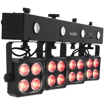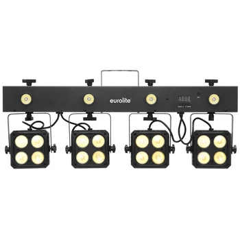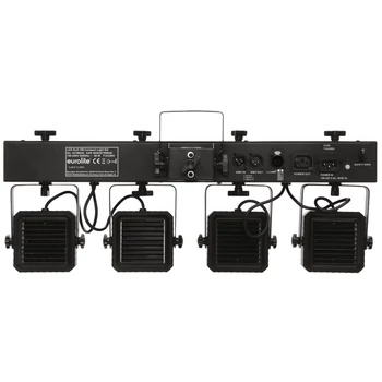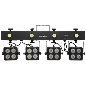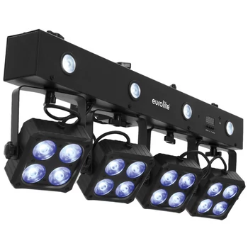 Kompakt szett 4 spot-al, 4 stroboszkóppal, infravörös távirányítóval, hordtáskával, spotonként 4db 4-színű (RGBW) LED-el, DMX vezérléssel, önálló és Master/Slave mód.