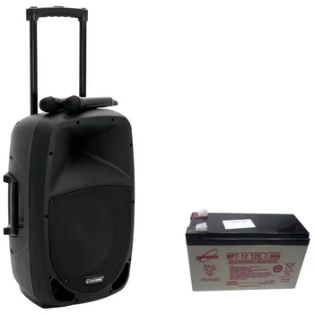 90 W-os hordozható hangfal, 2 mikrofonnal, audio lejátszó, Bluetooth, 12"-es mélysugárzó, 1"-es magassugárzó, tartozék akkumulátorral.